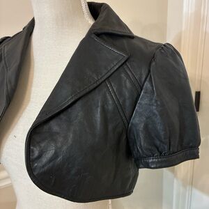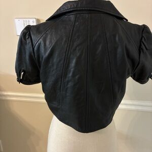 Stylish black leather cropped blazer with short sleeves. Perfect for a modern look.