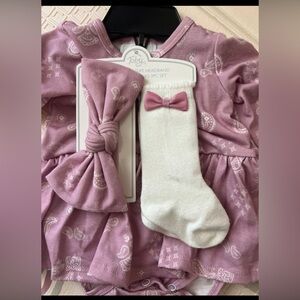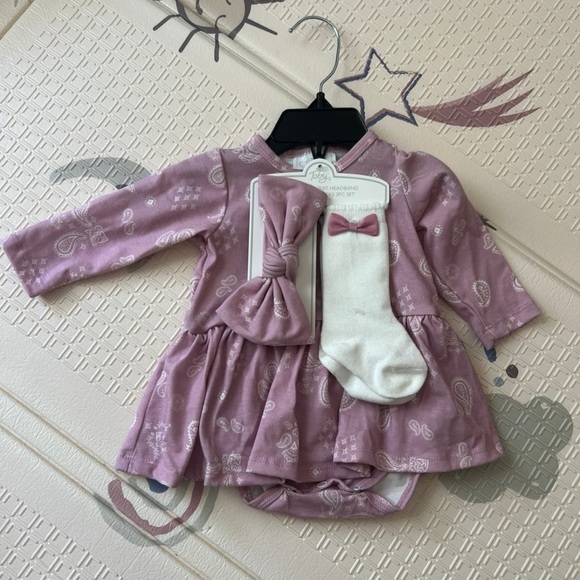 Brand new with tags. Pink/purple colored bandana pattern skirted body suit with headband & knee socks set.