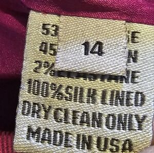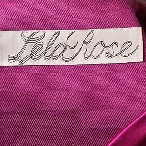 This Lela Rose dress is a stunning knee-length piece in a vibrant fuchsia color. Made from a luxurious blend of silk, viscose, cotton, and elastane, it features a flattering A-line silhouette with a V-neck and 3/4 sleeves. The dress is lined and has a back slit for ease of movement. Ideal for weddings, parties, formal occasions, or workwear, this elegant garment exudes a classic and timeless style. Crafted in the United States, it is designed for a size 14 fit and requires dry cleaning to maintain its quality.