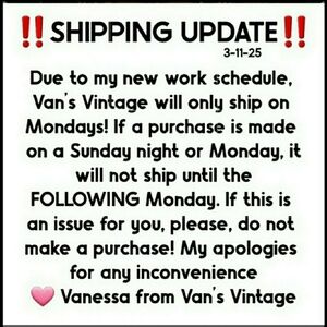 Due to my new work schedule, Van's Vintage will only ship on Mondays! If a purchase is made on a Sunday night or Monday, it will not ship until the FOLLOWING Monday. If this is an issue for you, please, do not make a purchase! My apologies for any inconvenience