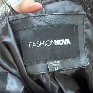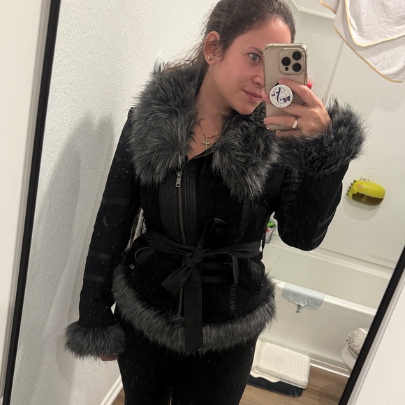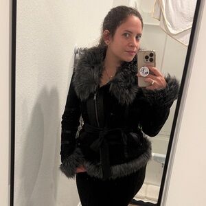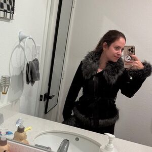 Chic black teddy jacket. Features plush faux fur trim. Stylish and cozy.