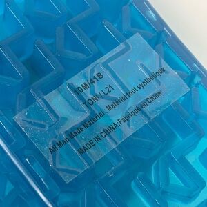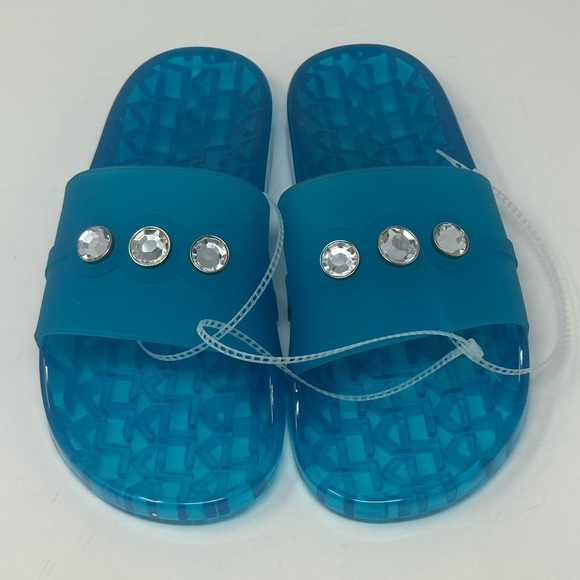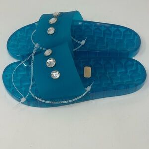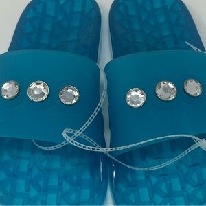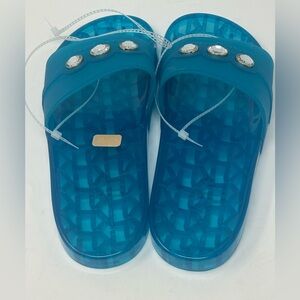 Stylish blue slide sandals. Features silver accents on the strap. Comfortable and chic design.