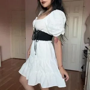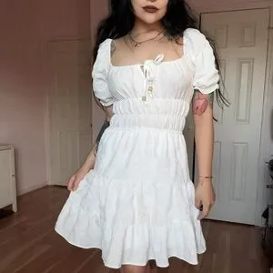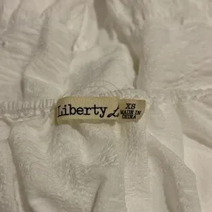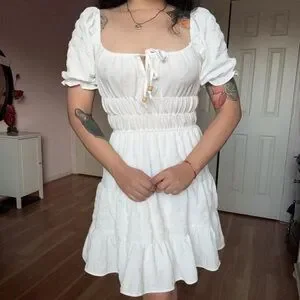 White tiered mini dress by Liberty Love • Milkmaid style top with ties at chest • Elastic waist • Puffy sleeves • So flirty and flowy 🤍