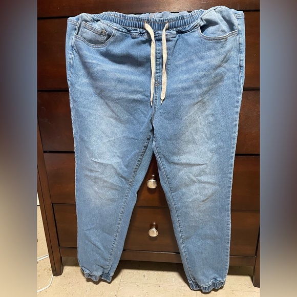 Casual relaxed fit jeans with a drawstring waist. Perfect for everyday wear.