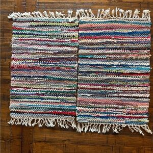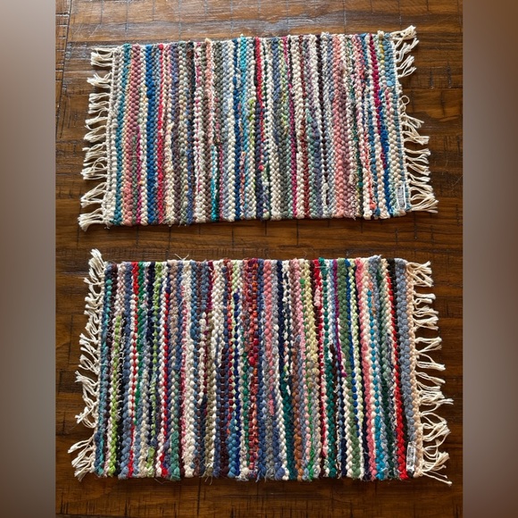 Bring a cozy, handmade touch to your home with this set of two handwoven rag placemats, each measuring 18” x 12”. Made with colorful woven cotton strips and finished with fringe, these pieces give off that perfect boho / rustic / cottagecore vibe.