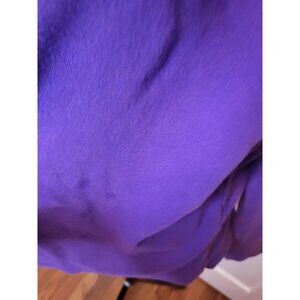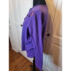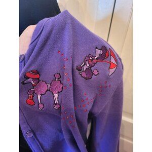 Purple and red cardigan features a purple background with red rhinestones and a lady in red hat walking a poodle. Great piece for those who dream of belonging to their own red hat club. Sweater has a stain on front as shown in 6th picture.
