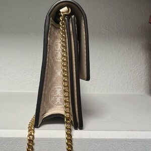 Color Ivory Height: 4.9" (12.5cm); length: 7.7" (19.5cm); depth: 1.8" (4.5cm) Jacquard; leather trim Microfiber lining with a suede-like finish Flap with magnetic snap closure Adjustable, removable chain strap with 21.5" (54.5cm) drop 1 interior bill pocket, 4 card pockets, 1 front wall slip pocket Iphone fits inside!