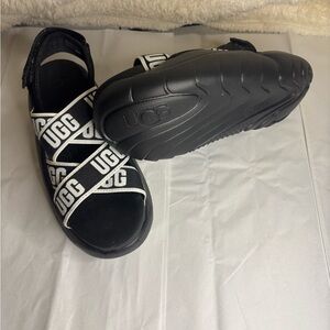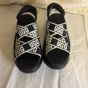 UGG sandals with crisscross straps. Features black and whitecolors. Ideal for everyday comfort. stretchy on top of foot and adjustable heal ! like new with out box