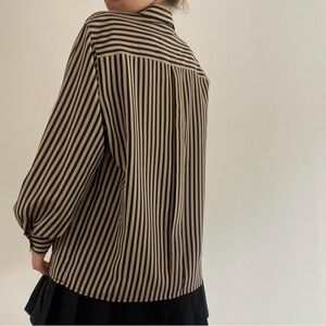 Elegant blouse with black and tan stripes. Ideal for versatile styling.