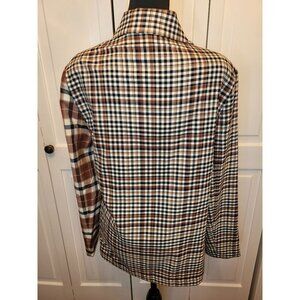Brown and black mismatched plaid double breasted blazer by Cato features shoulder pads, button closure, butterfly collar, and faux pockets. Blazer is made from a poly/rayon/spandex blend.