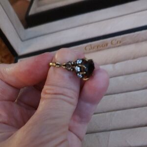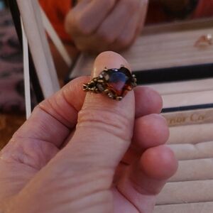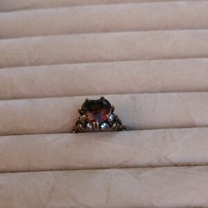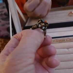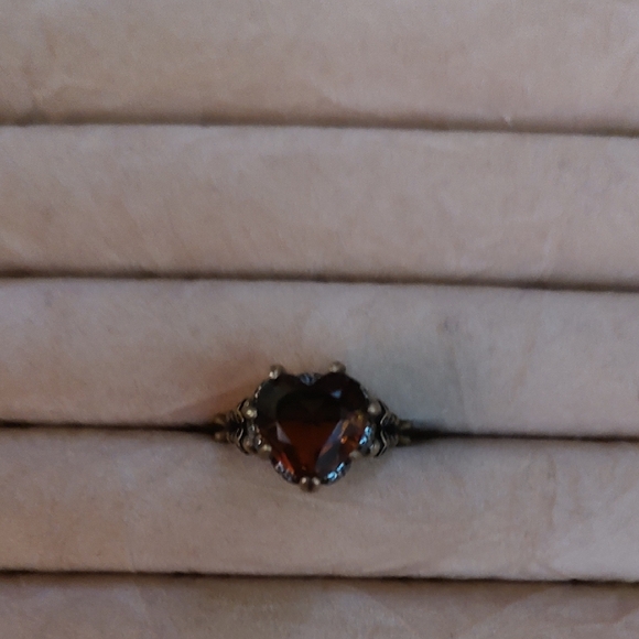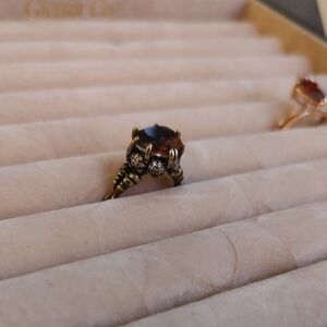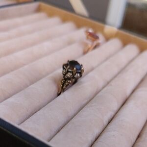 Heart-shaped garnet stone with intricate band. Whimsy tiny skeleton details adorn the brass toned band. Perfect for any occasion.
