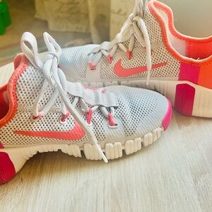 Nike sneakers with a vibrant coral swoosh. Breathable mesh design. Perfect for active wear. Coral, Pink and off white. Very nice. Just have too many and this I don’t wear much. Don’t have insoles. But in very very good condition from smoke pet free home.