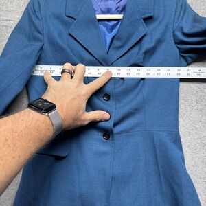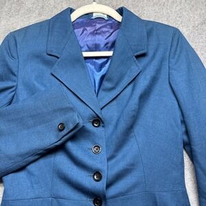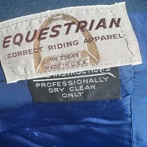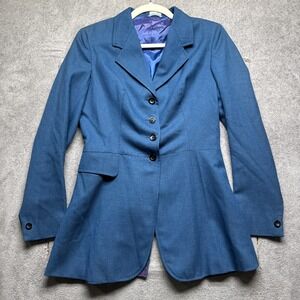 Classic women's blue equestrian show jacket with a flattering tailored silhouette and satin lining. Designed with a three-button front, this timeless riding blazer blends function and elegance for show, hunt, or barn events. Features dual rear vents, structured shoulders, and traditional styling perfect for competitions or equestrian-themed outfits.
