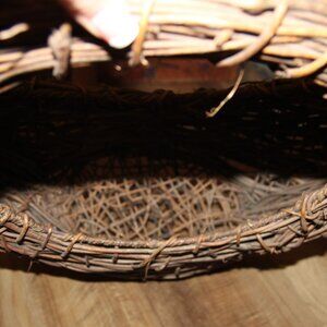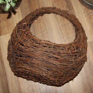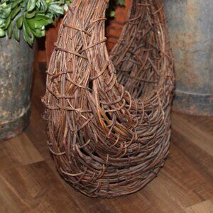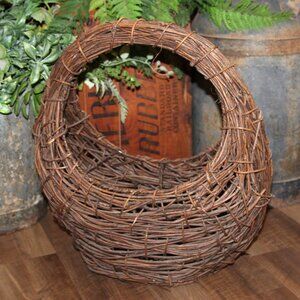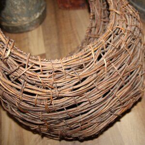 Large VTG 8.25" tall at center front x 20" tall to tip of handle x 18" wide x 7" deep grapevine and willow half moon crescent basket w/nice dark patina and a rustic weave. Perfect for filling with seasonal goodies for year round use! Excellent vintage condition! Awesome for Shabby Chic, French Country or rustic, primitive farmhouse decor/storage!