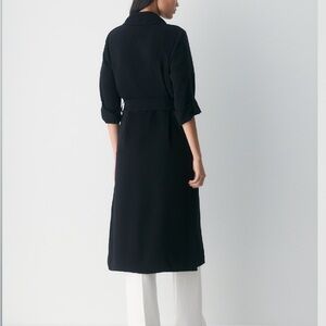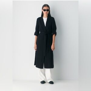 Elegant black trench coat. Features a belted waist. Roll-up sleeves for versatile styling.