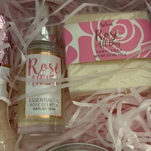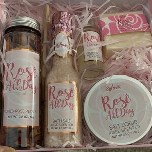 Indulge in a luxurious Rose All Day gift set. Includes dried roses, bath salt, and rose-scented scrub. Perfect for a relaxing spa day. From a smoke-free home.