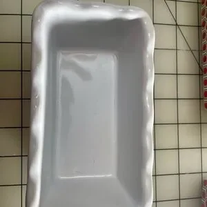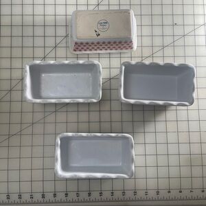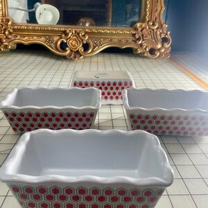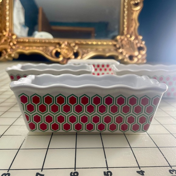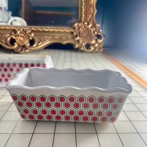 4 Stylish ceramic dish with a red and white hexagon pattern with scalloped edges. Perfect for baked gifts or decor.5”x2.5”