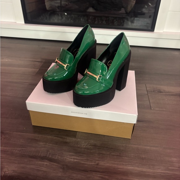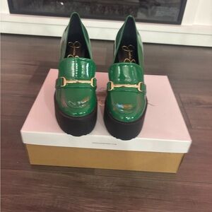 Glossy emerald green with chunky black platform. Elegant and bold style.