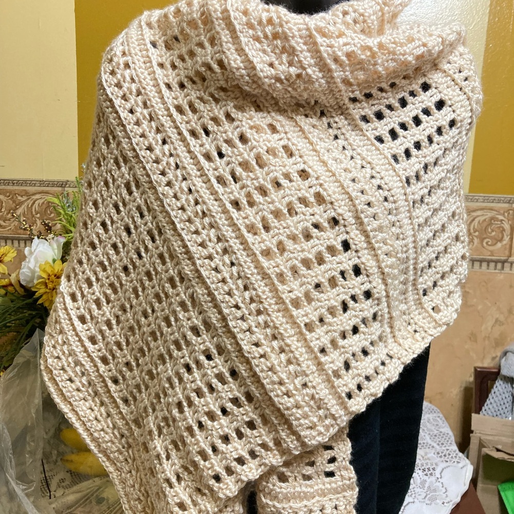 Elegant crochet shawl in a soft cream color. Perfect for layering.