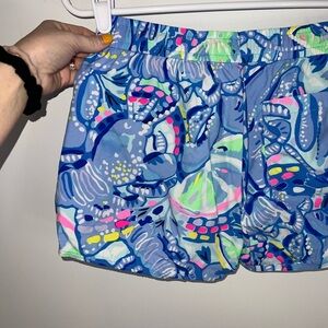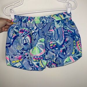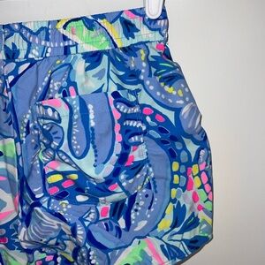 Vibrant athletic shorts with a colorful pattern. Features shades of blue, pink, and green.