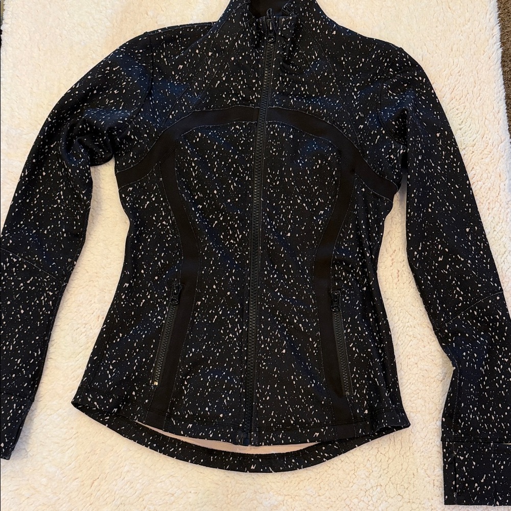 Black define jacket with white speckles. Designed for warmth and style. Ideal for winter sports and workouts.