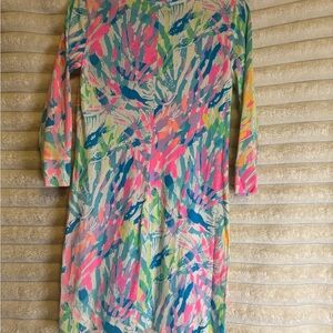Chic dress with a lively abstract pattern. Features pink, blue, and green hues. Ideal for a standout style.
