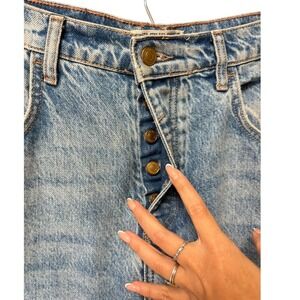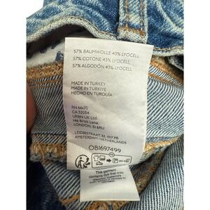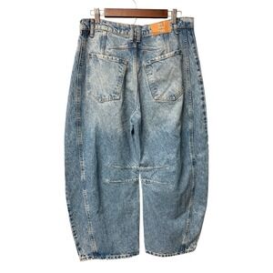 Keywords: barrel leg, mid rise, light wash, denim, button fly, loose fit, distressed details, casual, streetwear, everyday, modern, distressed, trendy, cotton lyocell blend