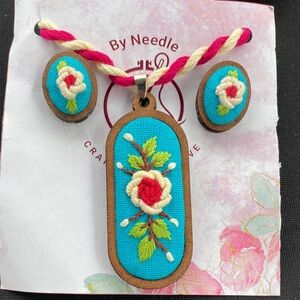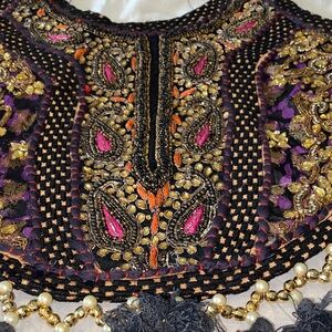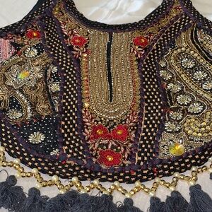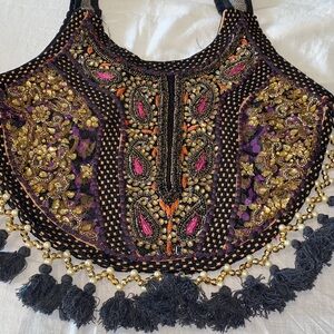 Colorful embroidered boho bag with intricate patterns and tassels. Features red, gold, and black details.