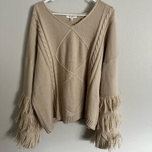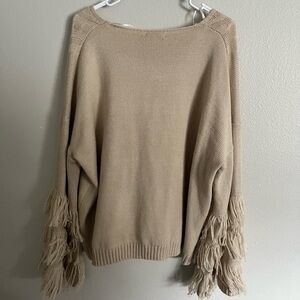 Chic V-neck sweater with fringe details. Soft knit fabric. Ideal for layering.