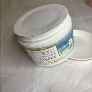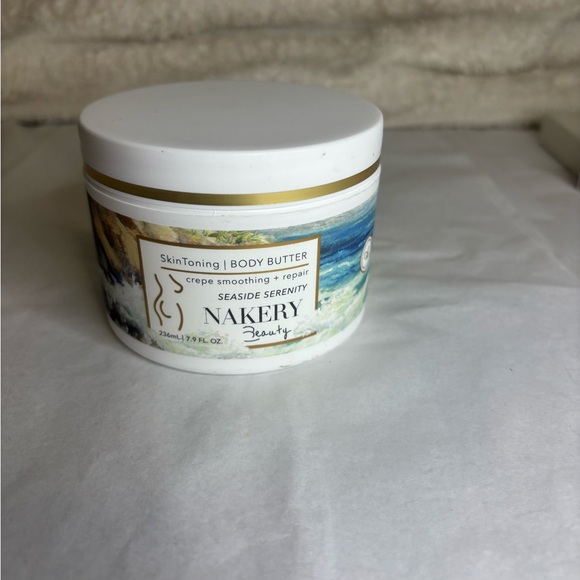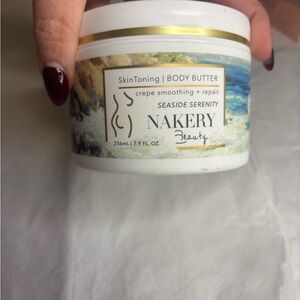 Indulge in Nakery Beauty's Seaside Serenity Body Butter. This white and gold formula nourishes and revitalizes your skin, leaving it silky smooth.