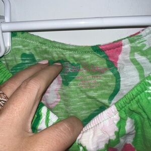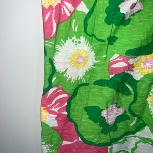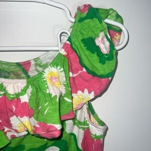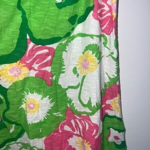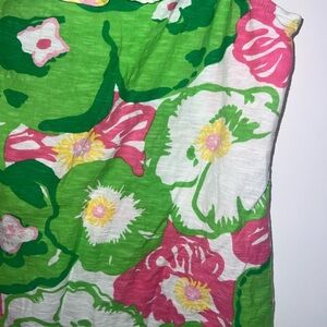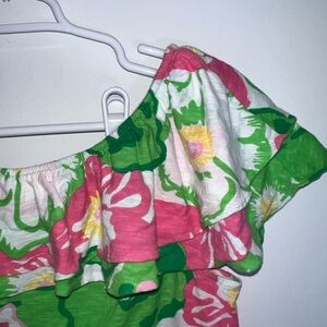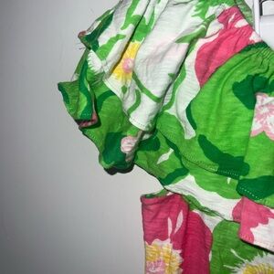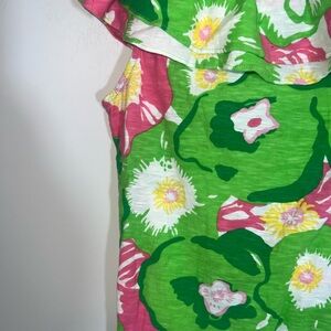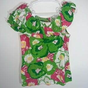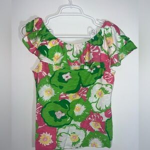 Charming floral blouse with ruffle detail. Bright green and pink hues. Ideal for a lively look. Lilly Pulitzer Wynne Ruffle Top Floral Ruffle Top - Green and Pink medium