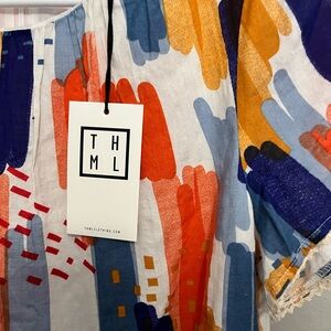 Vibrant dress with brushstroke pattern. Features short sleeves and a playful design. Ideal for casual outings.