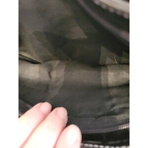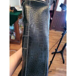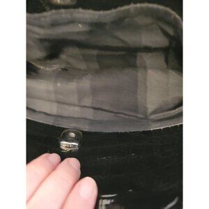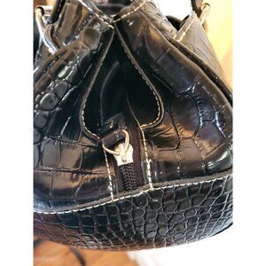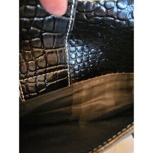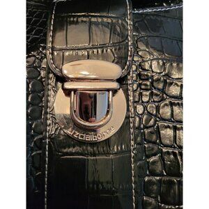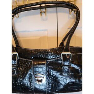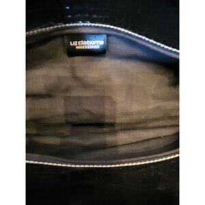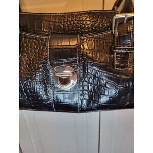 Black oblong, shoulder bag by Liz Claiborne offers classic styling with a y2K flair. Bag features multiple pockets and compartments for organization, silver buckles, handles, and a large silver clasp. In a croc embossed texture, this bag exudes classic style and class.