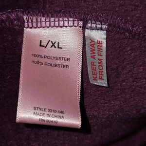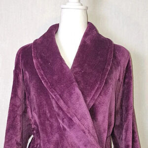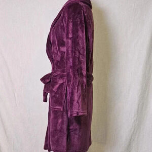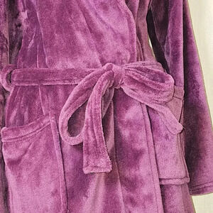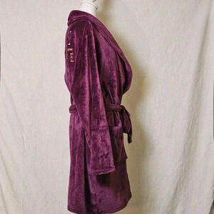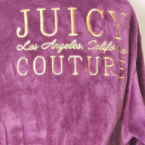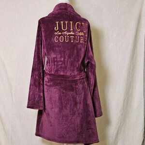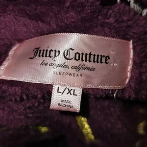 Indulge in luxury with this Juicy Couture Plum Logo Plush Velvet Bathrobe. The robe features a solid pattern with long sleeves and a tie closure. The size is L/XL and the material is made of soft and cozy polyester with a velvet fabric type. The robe comes in a beautiful shade of purple with the iconic Juicy Couture logo accent.