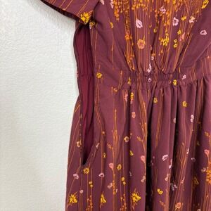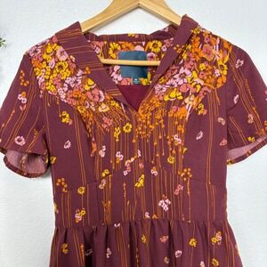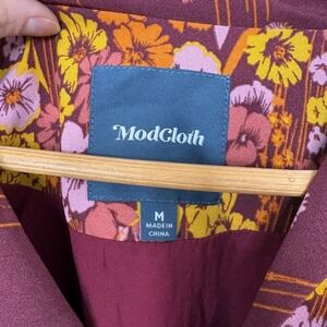 Bloom vibrantly in this charming ModCloth dress, designed to capture the essence of a whimsical garden. The rich burgundy canvas is adorned with a playful dance of tiny blossoms in sunny yellow, soft pink, and warm orange, interspersed with delicate vertical lines that create a flattering silhouette. A classic collared neckline and short sleeves offer a touch of vintage charm, while the cinched waist and flared skirt create a delightful, feminine shape. Pockets integrated into the side seams add a practical, modern touch. Perfect for a casual brunch, a charming picnic, or a day of exploring a picturesque town.