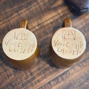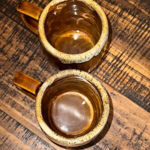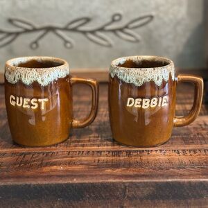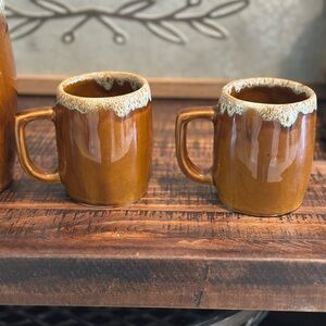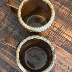 The Vintage Van Briggle Drip Glaze Pitcher and Personalized Drip Glaze Mugs Set includes a large pitcher with a capacity of 2 quarts and two personalized mugs, all made of fired clay (ceramic) with a brown drip glaze finish. This set showcases the Mid-Century Modernism style popular in the 1940-1980 time period and is a collectible piece from the Van Briggle franchise, originating from the United States. Perfect for adding a touch of vintage charm to any kitchen or dining space, this set is a unique and stylish addition to any collection.