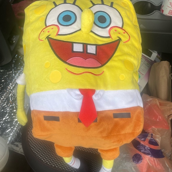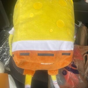 Bright yellow SpongeBob SquarePants plush toy with orange pants and a red tie. Perfect for fans of the iconic character.