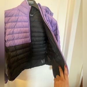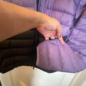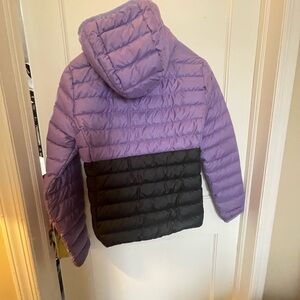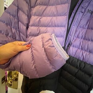 Marmot jacket with a striking purple and black design. Ideal for chilly days. Gently used one season, the back of sleeve has some discoloration but not noticeable. No other issues EUC.