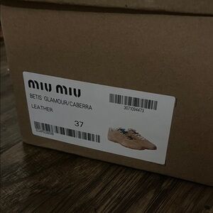 Chic Miu Miu sneakers in beige. Features teal and brown laces. Shoes fits 6.5-7