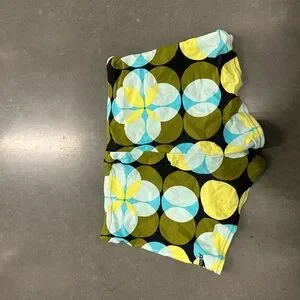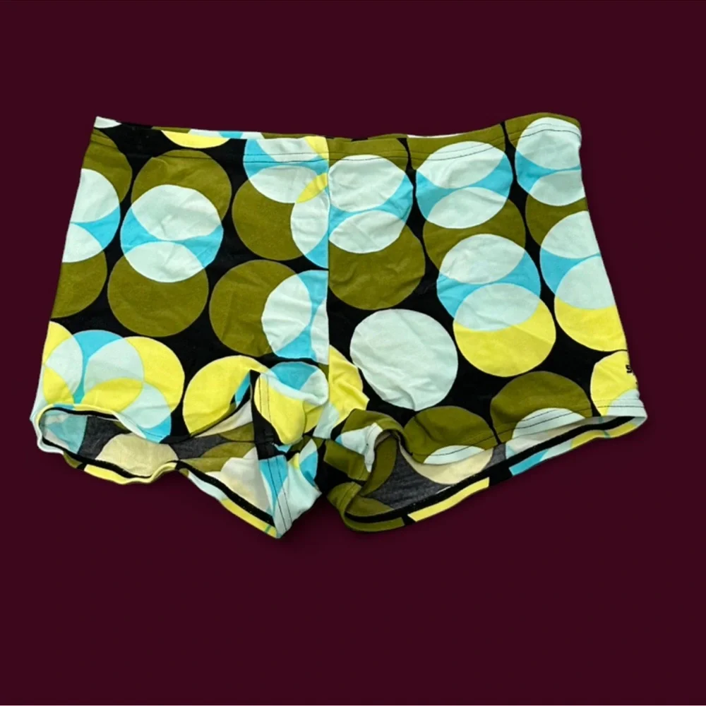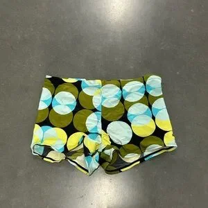 Vibrant shorts with a geometric circle pattern. Features shades of blue, yellow, and black.