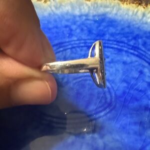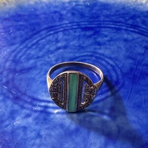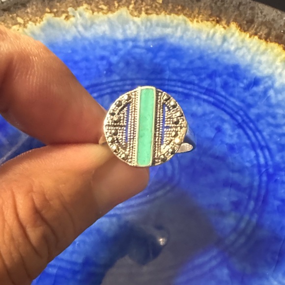 Elegant silver ring featuring a striking turquoise inlay. Perfect for adding a touch of color to any outfit. The ring is set in sterling silver "925" stamp. The central stone is a vibrant blue turquoise inlay, and it is accented by small, metallic marcasite stones.
