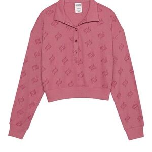Stylish collared top. Button-up front. Soft fabric with logo pattern.