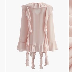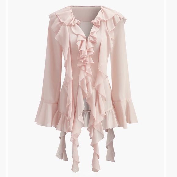 This Commense light pink semi-sheer chiffon blouse features cascading ruffles, a soft draped silhouette, and subtle flounce cuffs for an elevated coquette look.