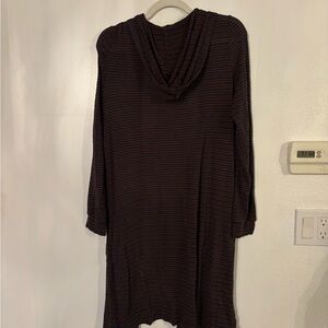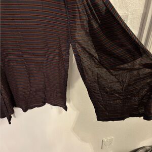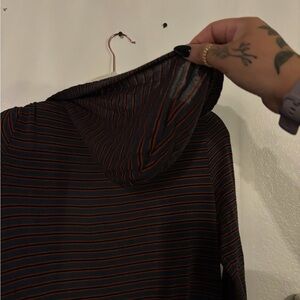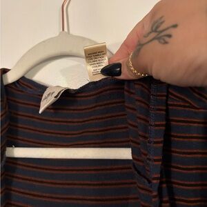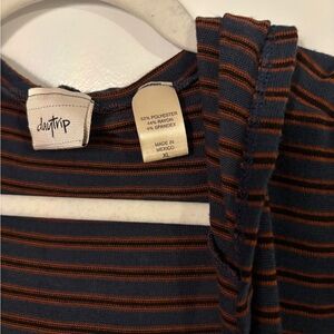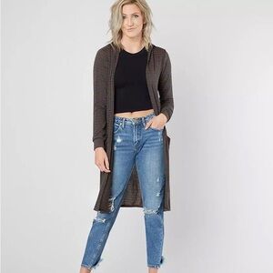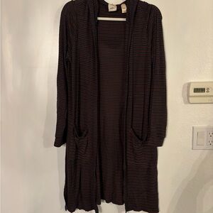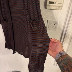 Chic cardigan with navy and orange stripes. Soft fabric. Perfect for layering.