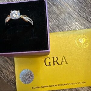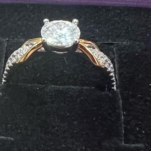This stunning women's Moissanite ring features a beautiful blend of gold and silver tones, perfect for any occasion. Its elegant design adds a touch of sophistication to your jewelry collection. It is set in WG over a nickel free base metal.