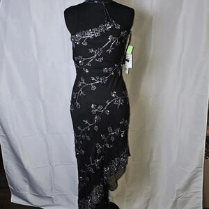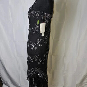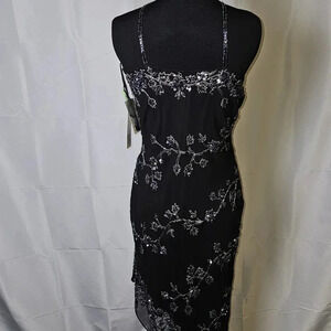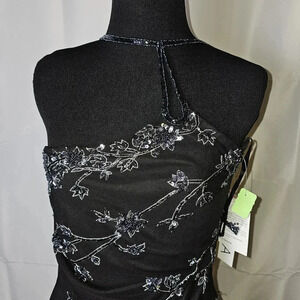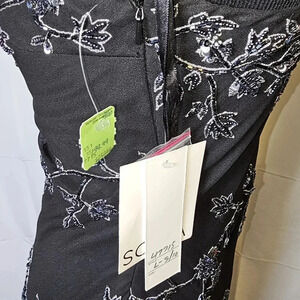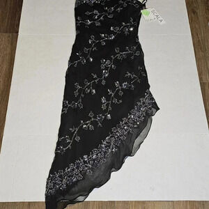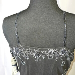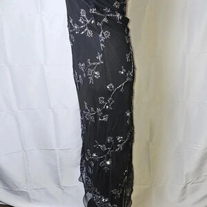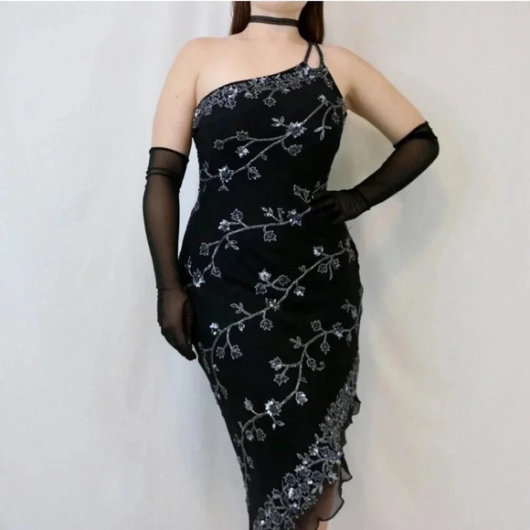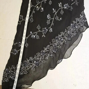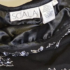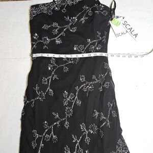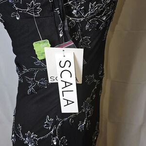 This vintage Scala evening dress is a stunning piece that will make you stand out from the crowd. The dress is made of 100% silk and features intricate beadwork, making it a perfect choice for a special occasion. The dress is from the 1990s and has a unique, asymmetrical design that adds a touch of playfulness to the overall look. The dress is available in size L and is suitable for regular size types. The dress is perfect for eveningwear and comes in a classic black color that will complement any skin tone.