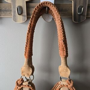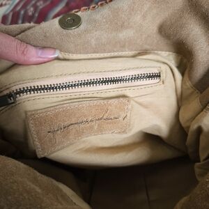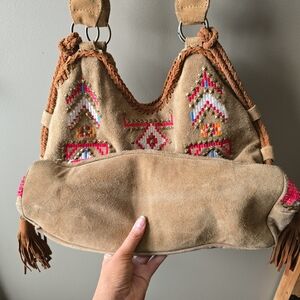 "Tribal-styled suede tote bag featuring beautiful embroidery and metal stud embellishments. Contrast braided trim with tassel ends and top handles. Snap closure with a lined interior featuring slip and zip pockets."