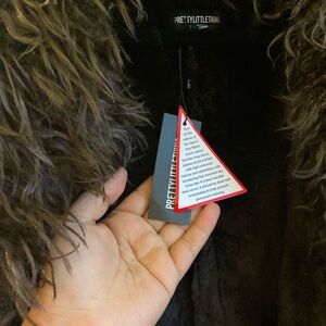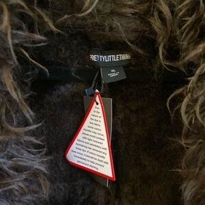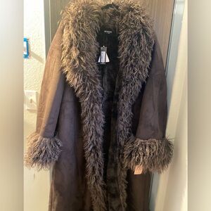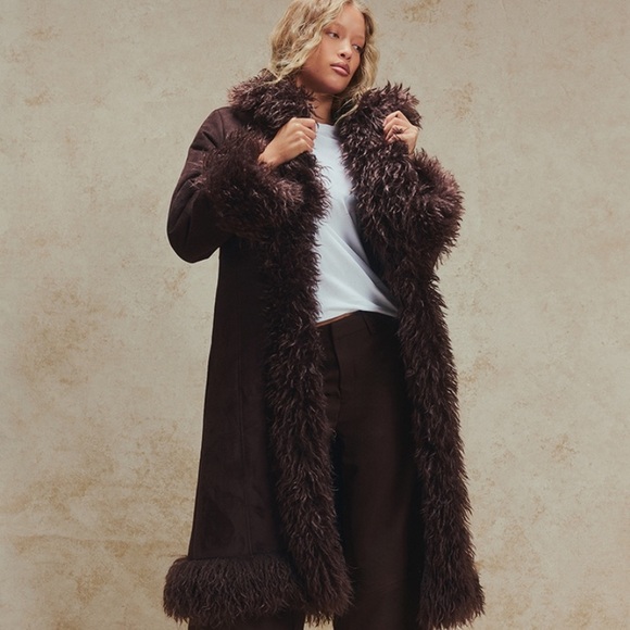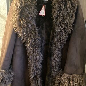 Luxurious brown coat with faux fur trim. Perfect for stylish warmth.