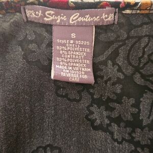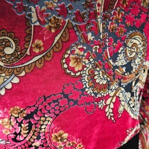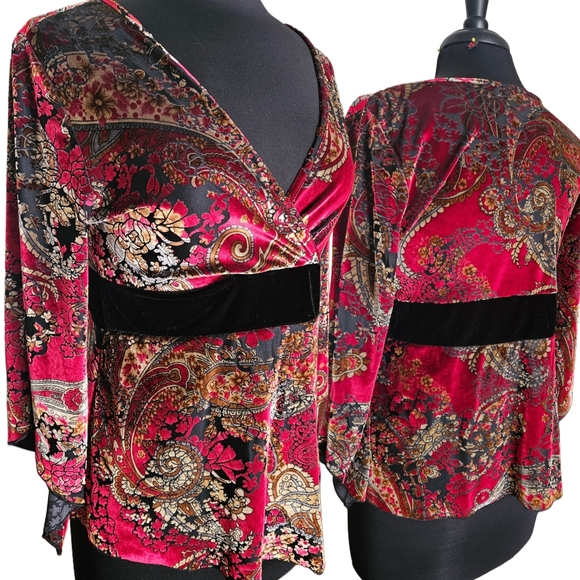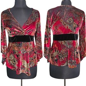 Very pretty paisley velvet top. Has 3/4 bell sleeves and a surplice style v neck. Very witchy/whimsigoth! It's marked a size small, but fits more of a medium. I'm a true medium and this fit me perfectly. Could stretch out to a large, but just keep the neckline in mind.