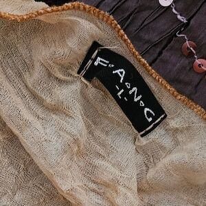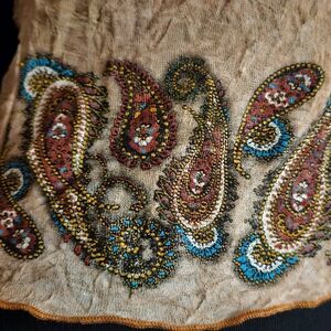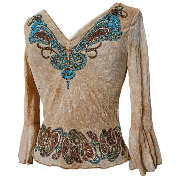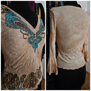 Vintage Fang boho top. Love this but don't really wear it. The beading is faux, as it looks like it's glitter screen printed on. The paisley at the bottom is the same, screen printed and not real beads. Fabric is supposed to look crinkled.